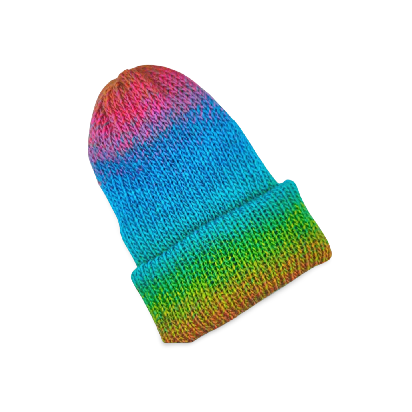 • handmade knitted reversible beanie in beautifully bright rainbow colours (colour variations will vary slightly from photos due to the nature of the yarn) • double-layered for extra warmth and comfort • machine washable and dryable • soft and stretchy
