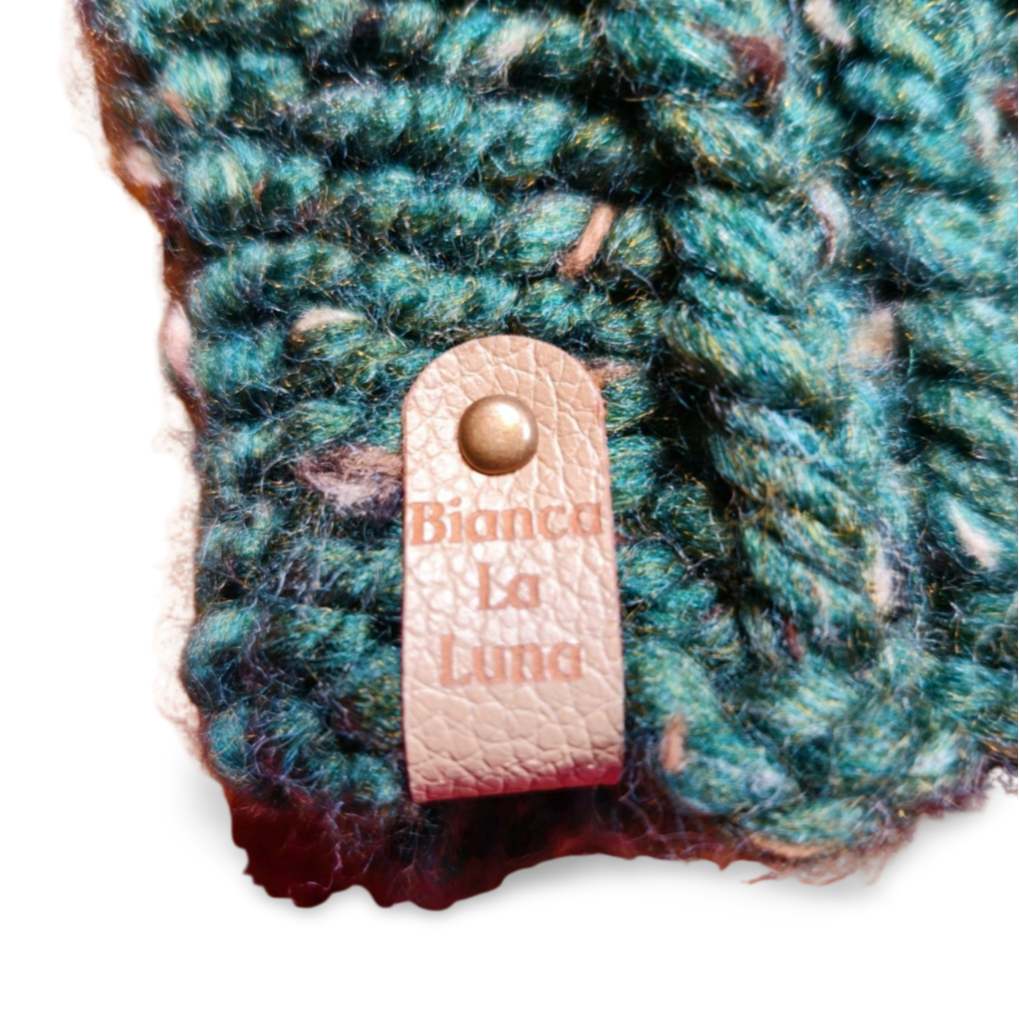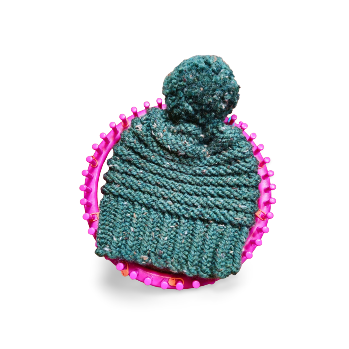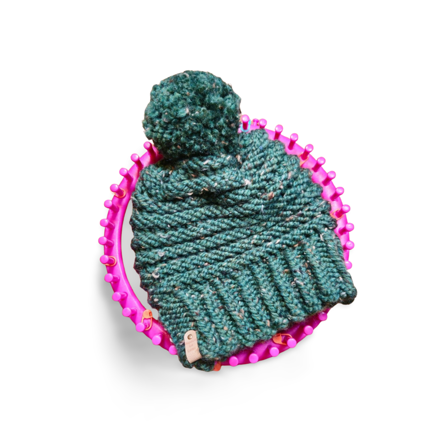 • handmade loom knitted beanie with matching pompom in a beautiful dark green colour with brown and white tweed woven throughout • made with thicker yarn for extra warmth and comfort from the cold • handmade with love