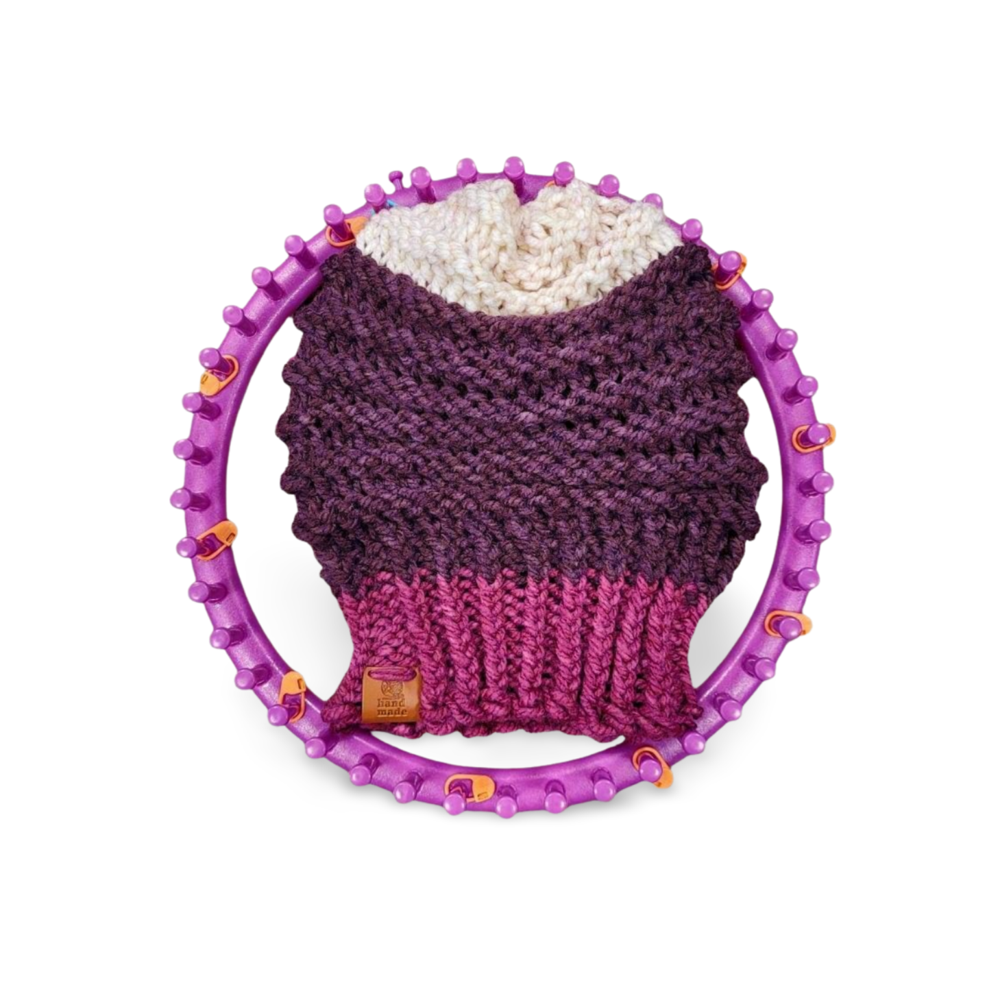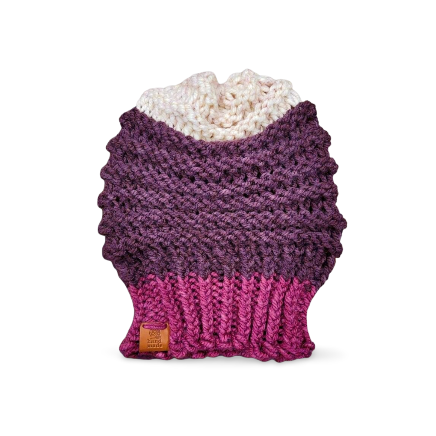 • handmade loom-knit beanie hat in shades of purple with white on top • thick yarn for extra warmth and comfort from the cold • machine washable and dryable • handmade with love