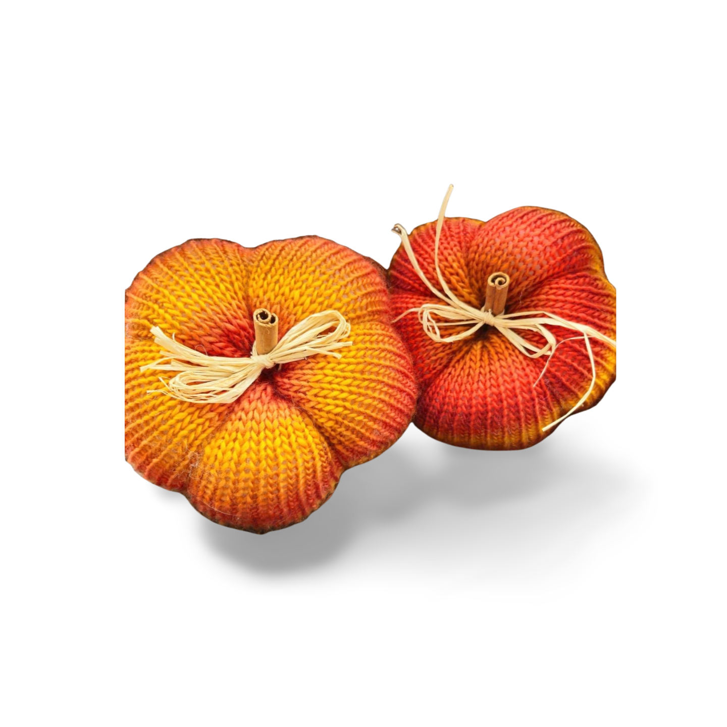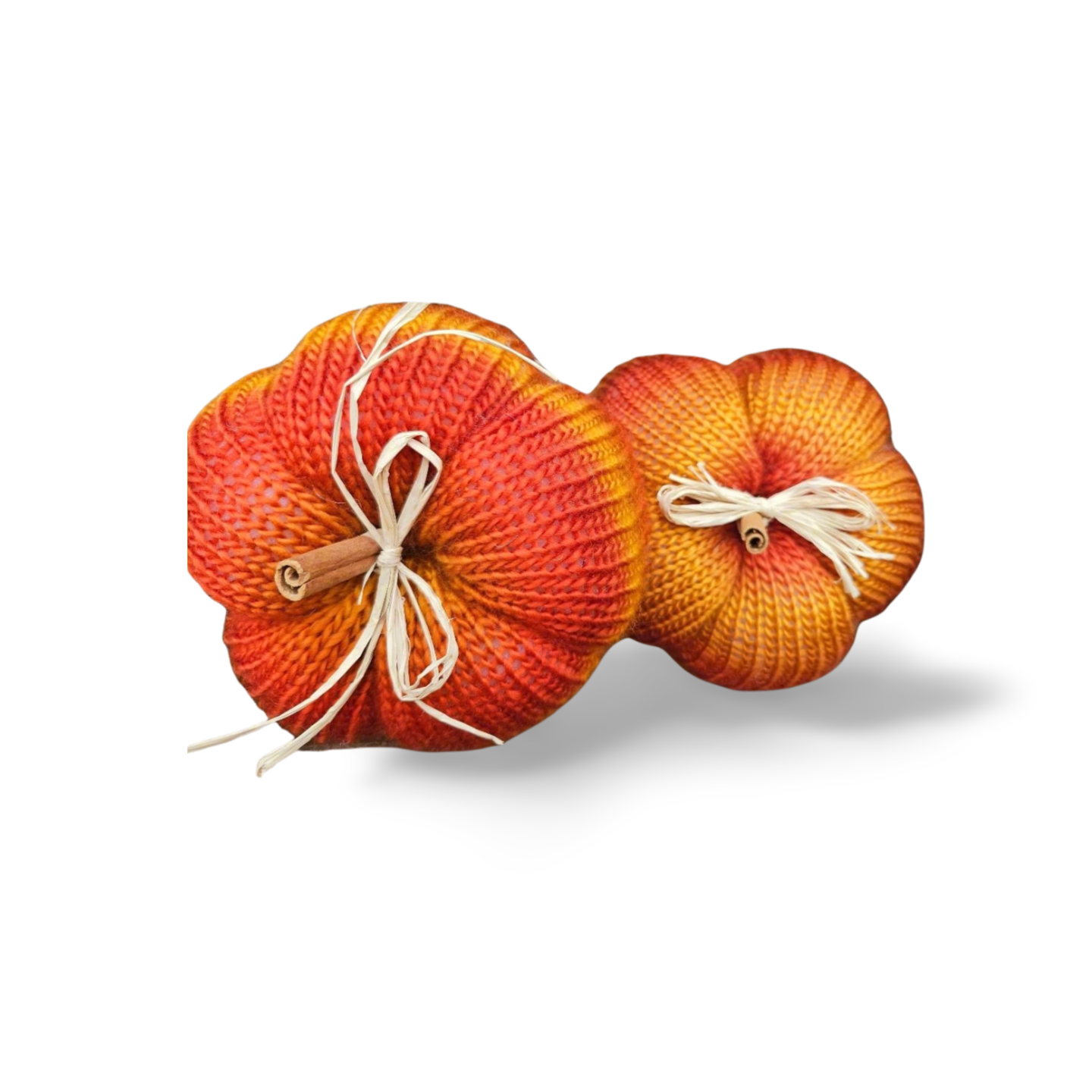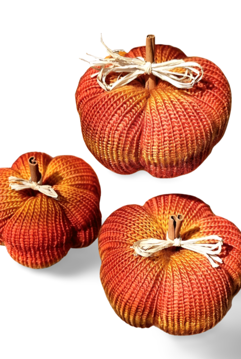• handmade knitted pumpkins in beautiful gradient orange and yellow colours • perfect decoration for the autumn, Halloween, and Thanksgiving seasons • stuffed with soft and fluffy hypoallergenic polyester Polyfil • complete with a cinnamon stick as a stem and bow • handmade with love