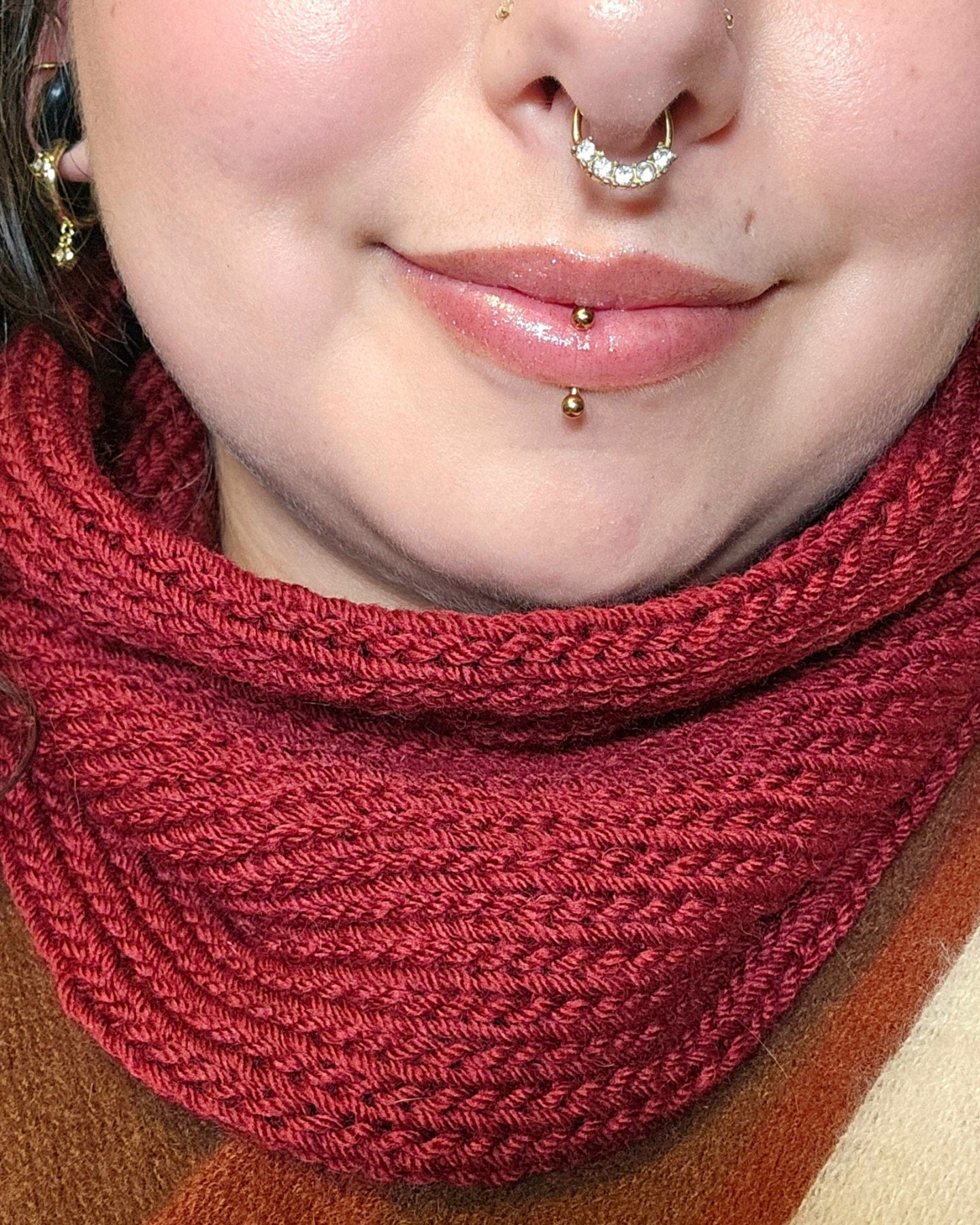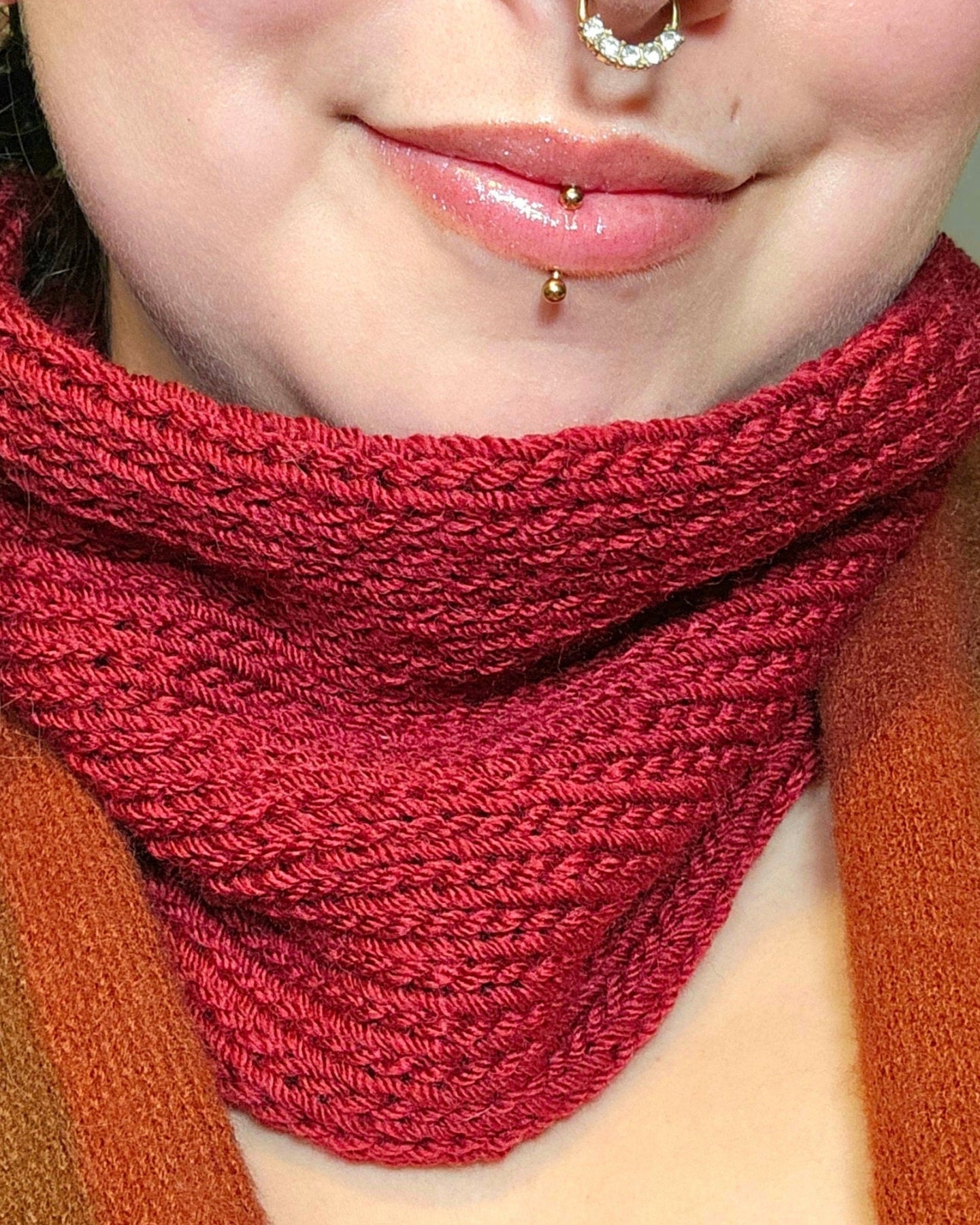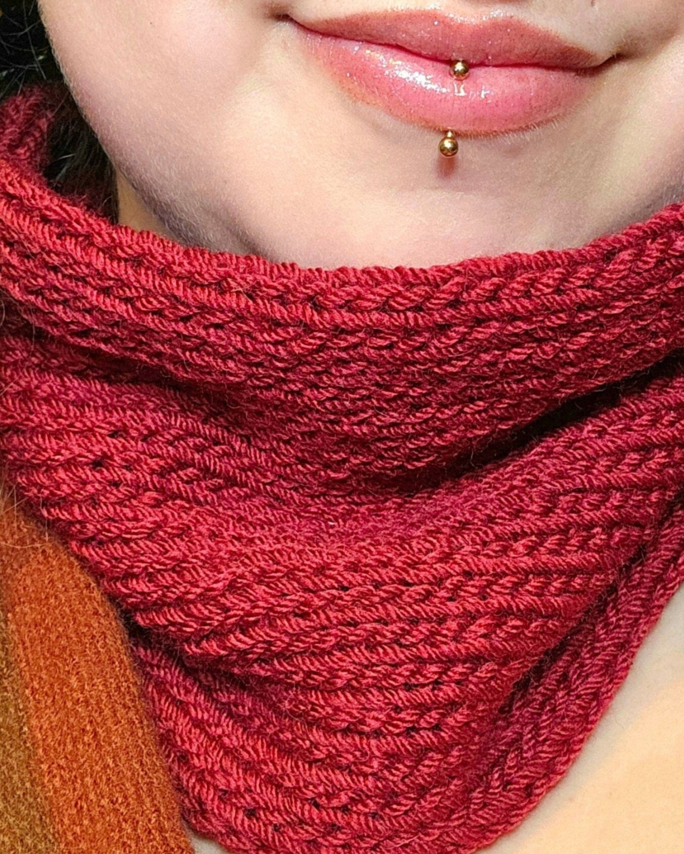 • handmade knitted cowl scarf in a beautiful, rich burgundy red colour