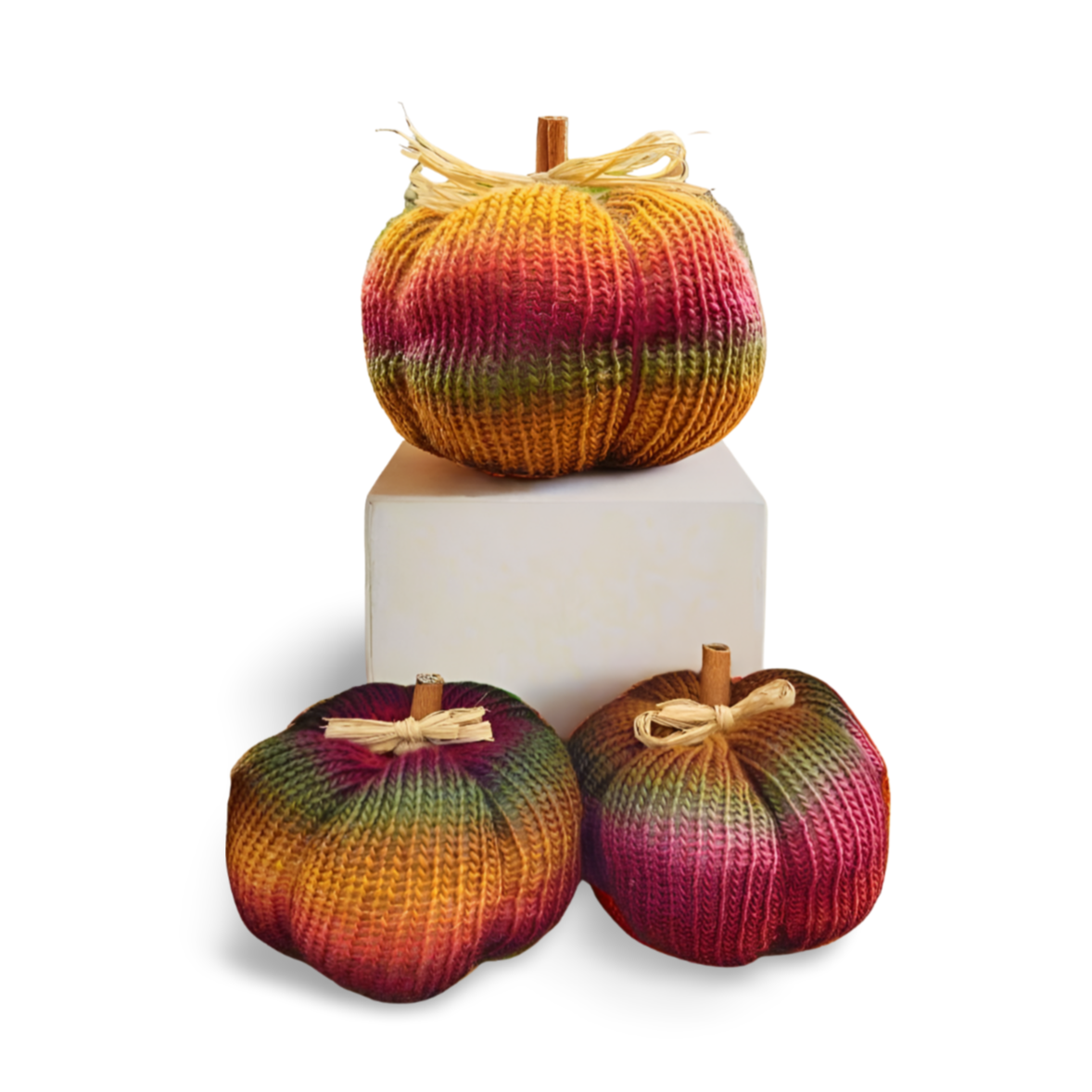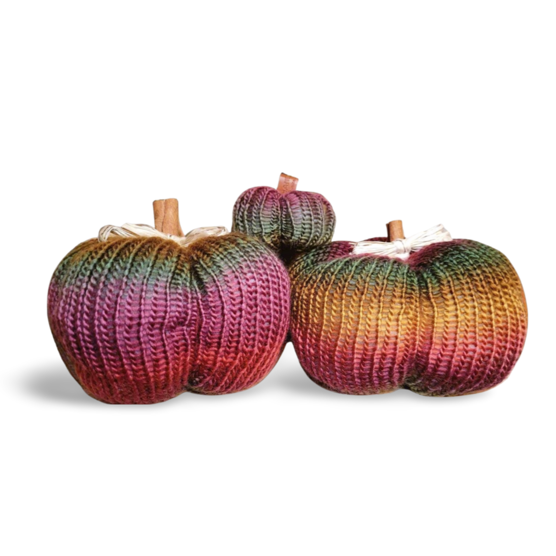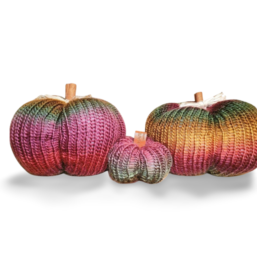 • handmade knitted pumpkins • gradient purple, green, yellow, and red colours inspired by the colours of autumn • perfect decoration for the autumn, Halloween, and Thanksgiving seasons • stuffed with soft and fluffy hypoallergenic polyester Polyfil • complete with a cinnamon stick stem • handmade with love