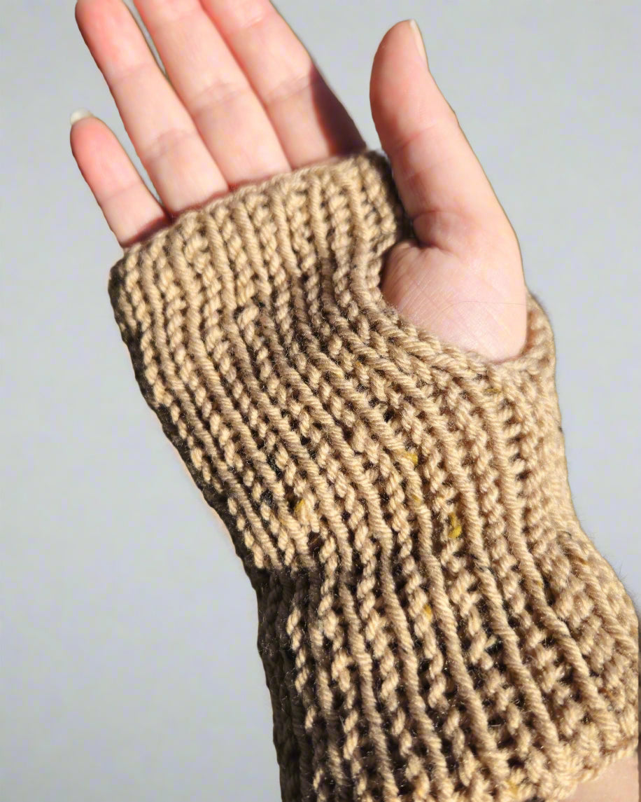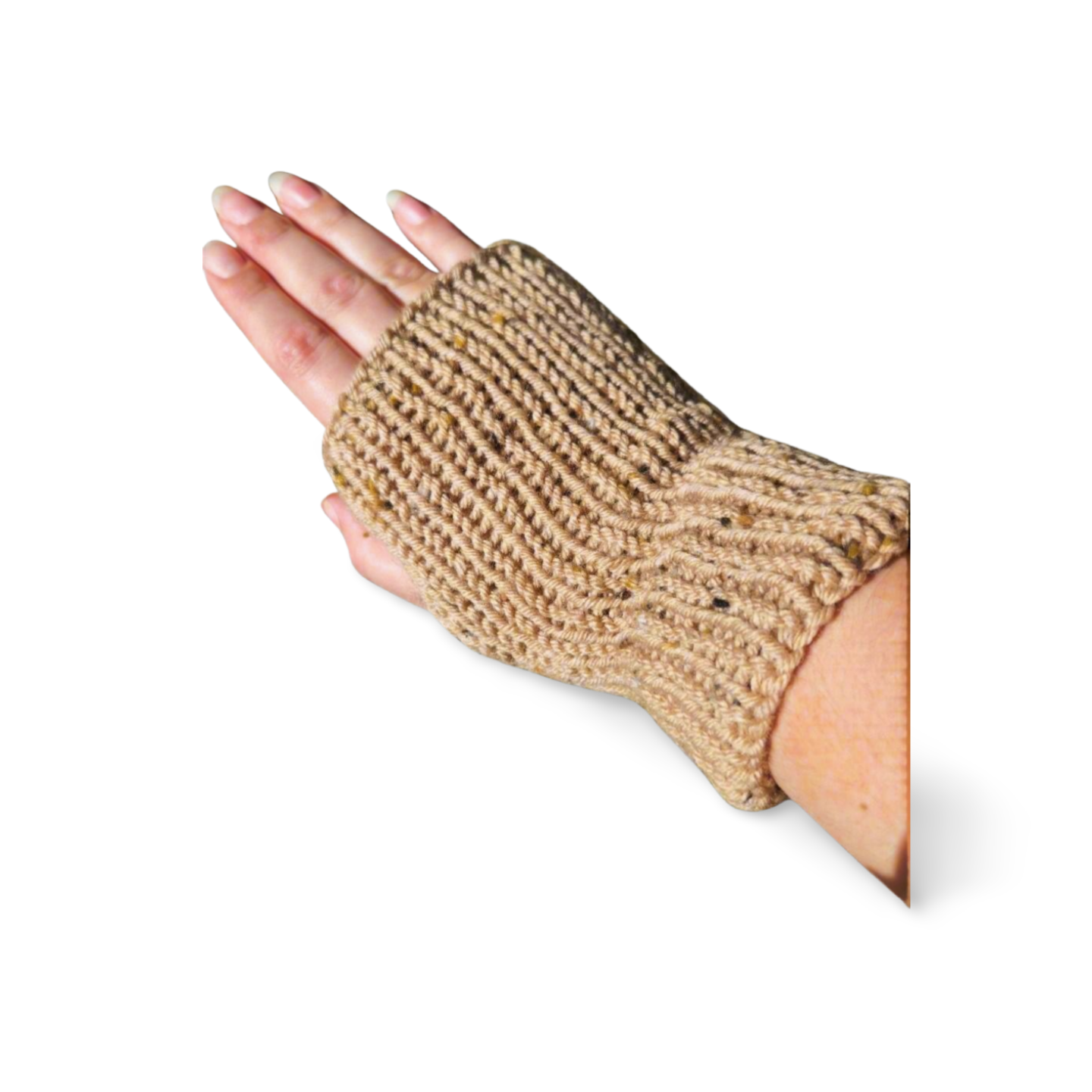 • handmade pair of knitted fingerless gloves in a beautiful beige colour with black tweed woven throughout