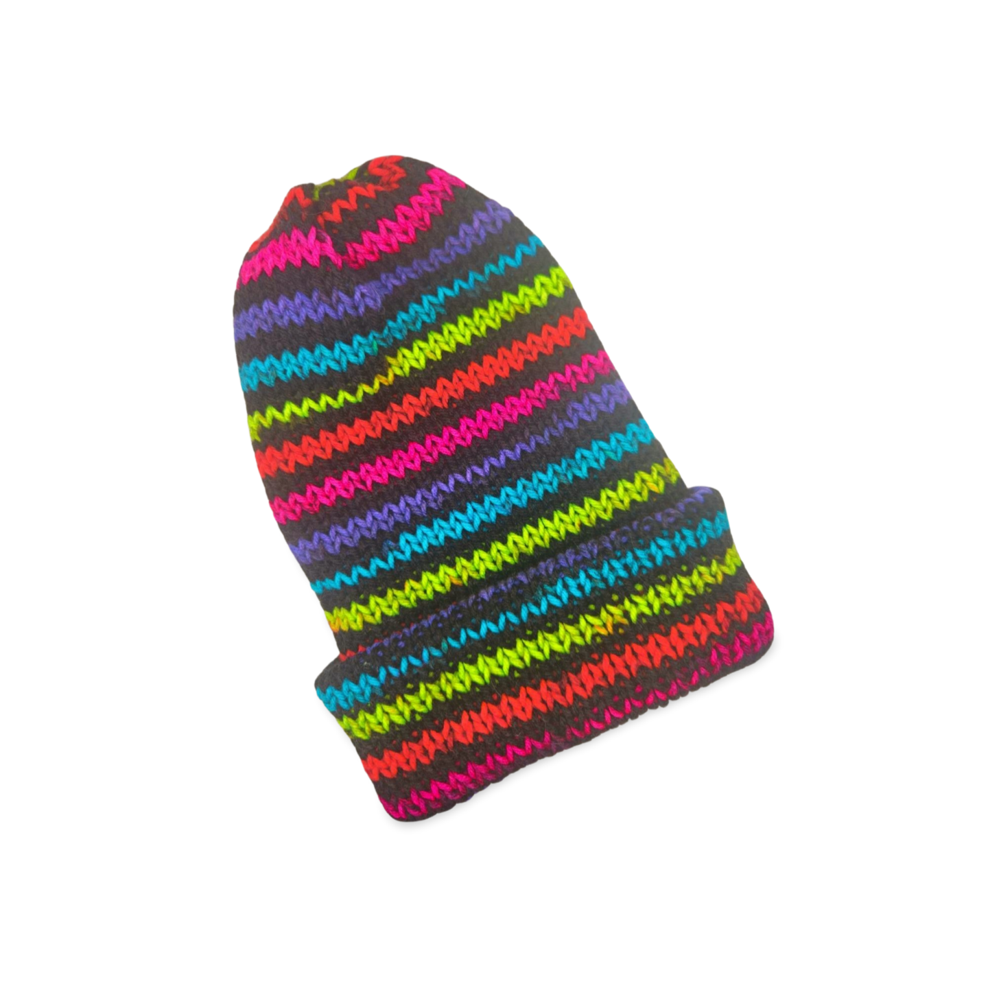 • handmade knitted beanie in bright black, red, green, blue, purple, and pink stripes