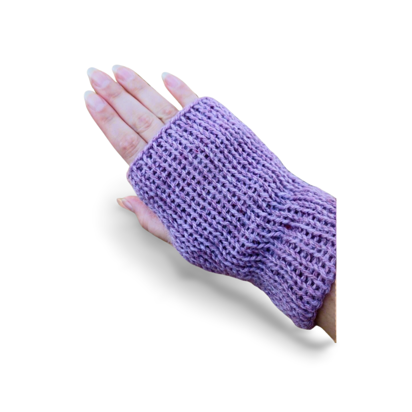 • handmade pair of knitted fingerless gloves made with a super soft recycled polyester yarn