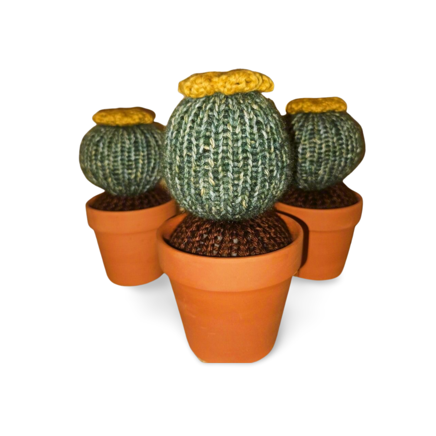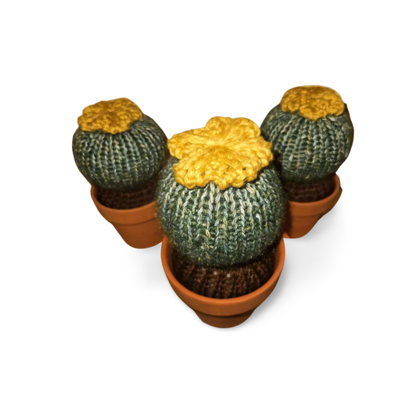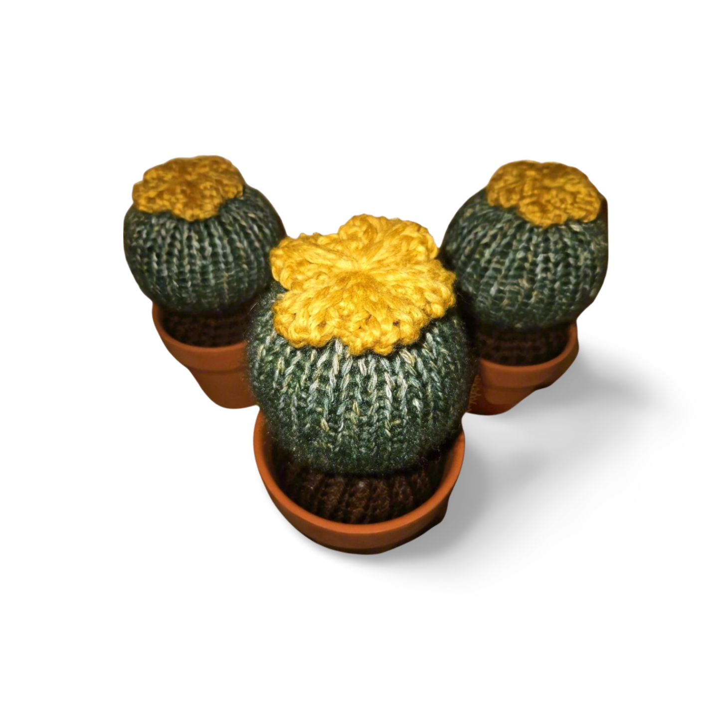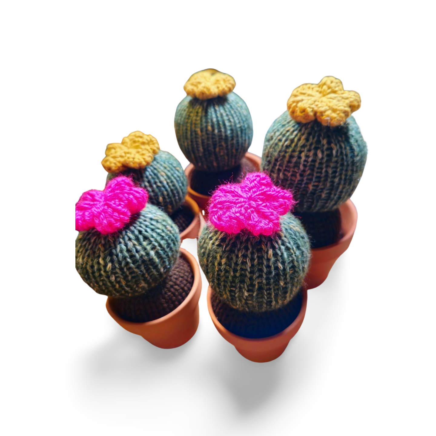 • handmade knitted barrel cactus with flower on top in a small clay pot 🌵