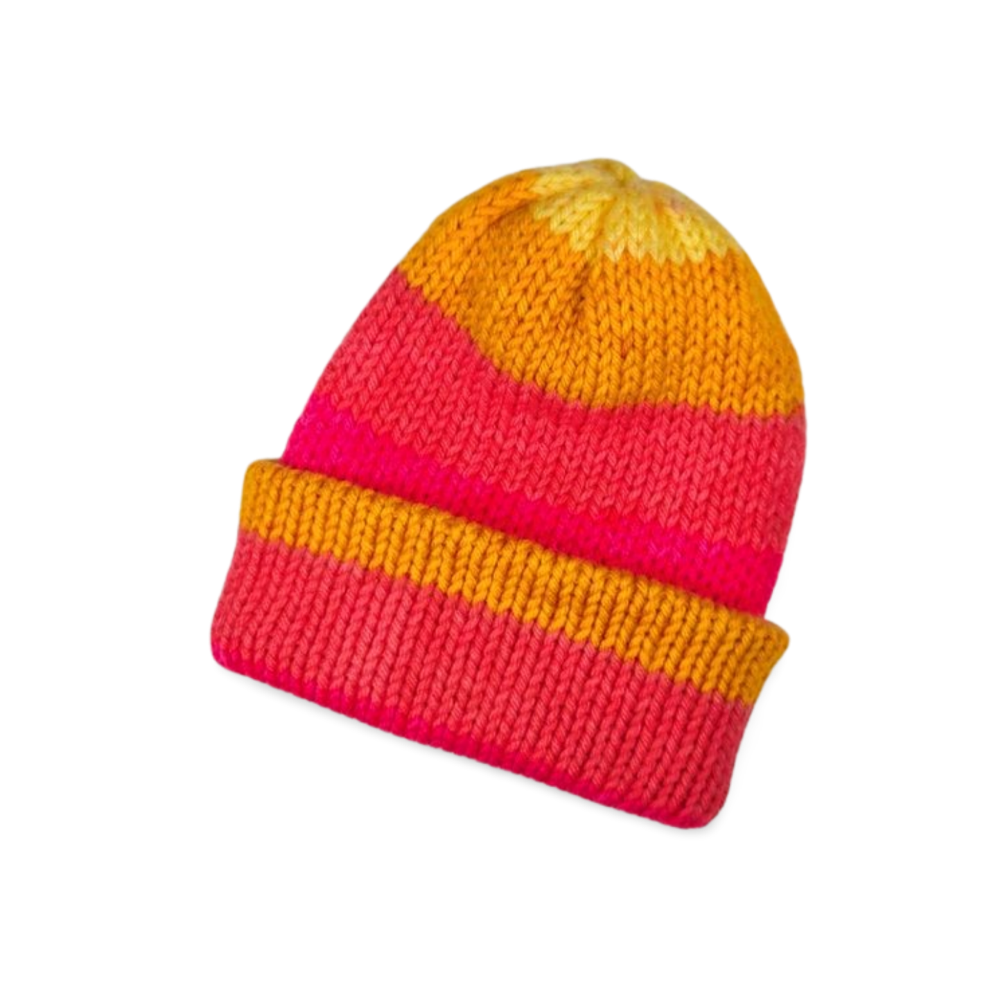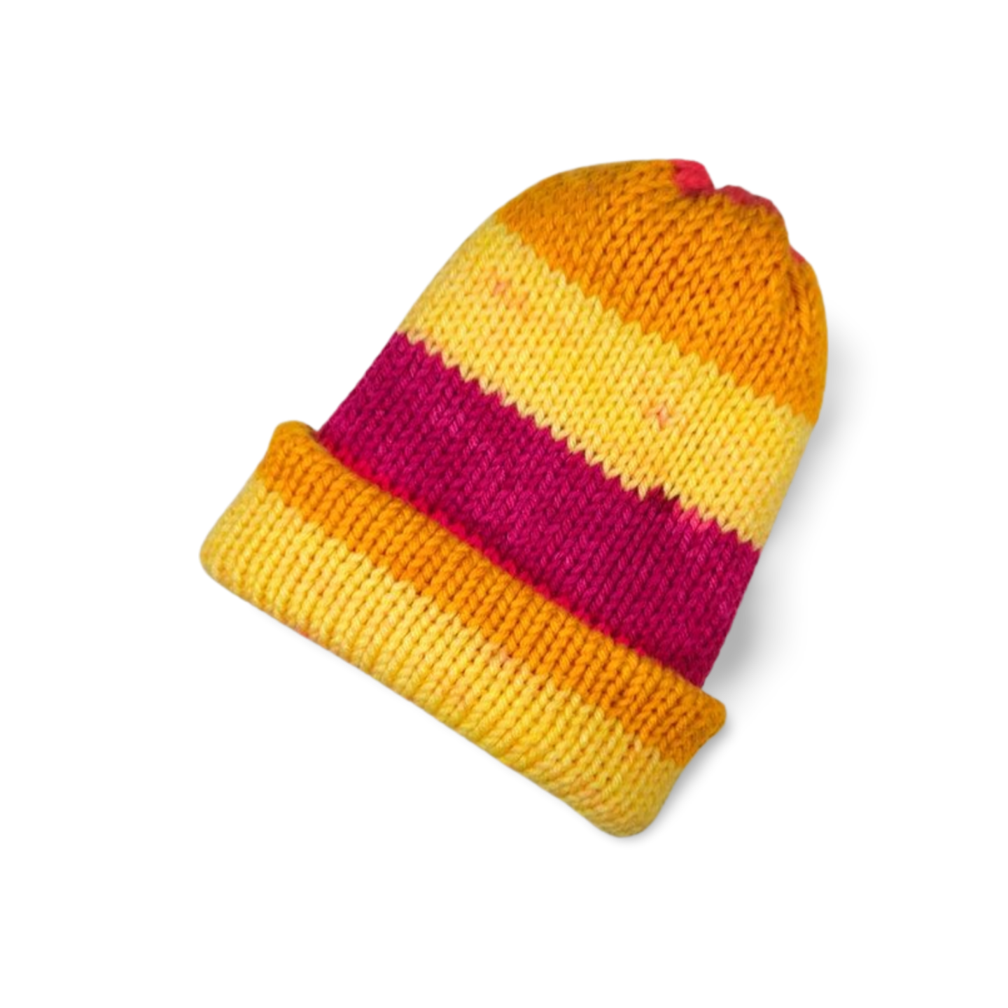 • handmade knitted pink, yellow, orange, and purple striped beanie hat (colour scheme varies slightly from photos due to the nature of the yarn)