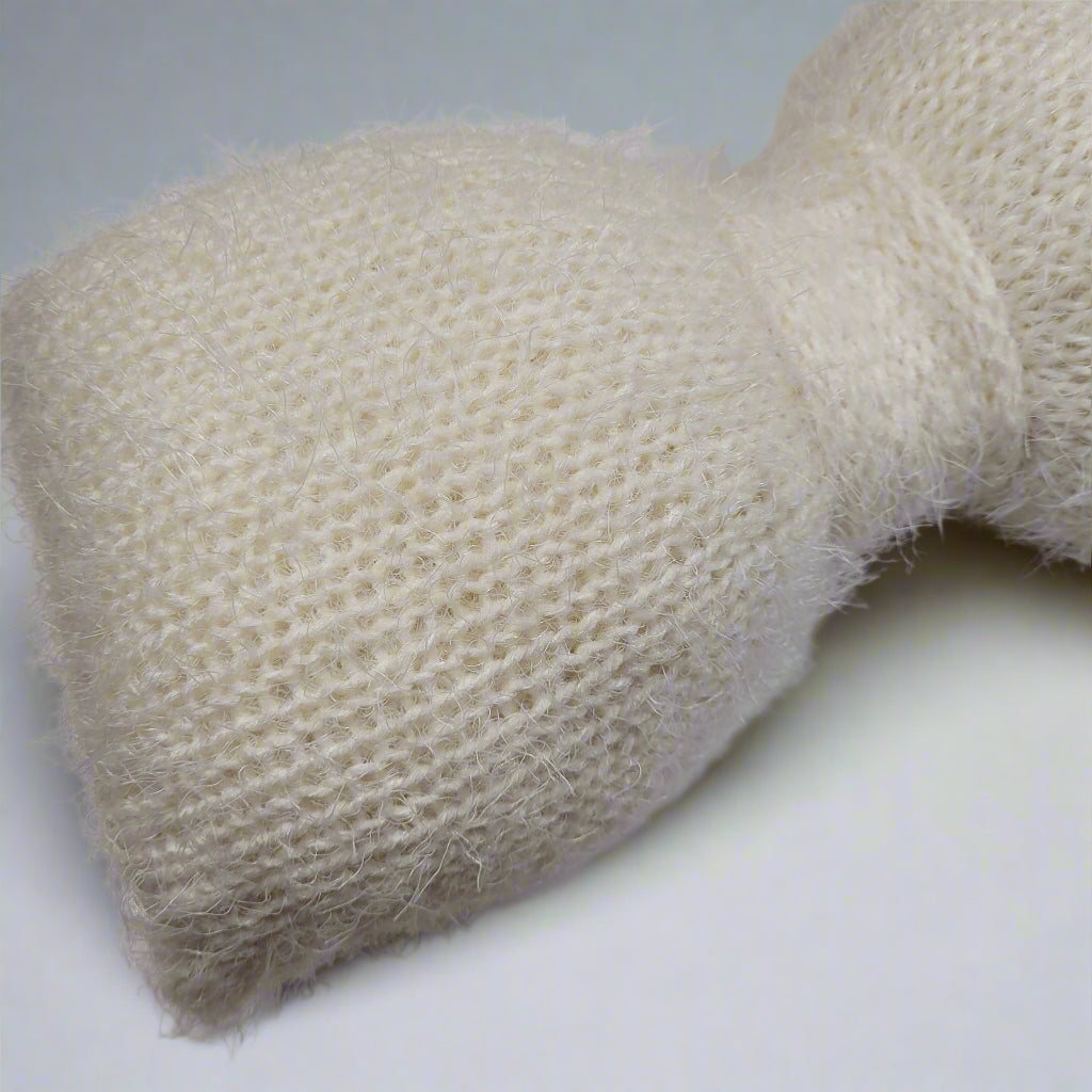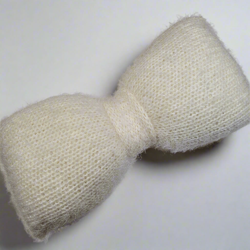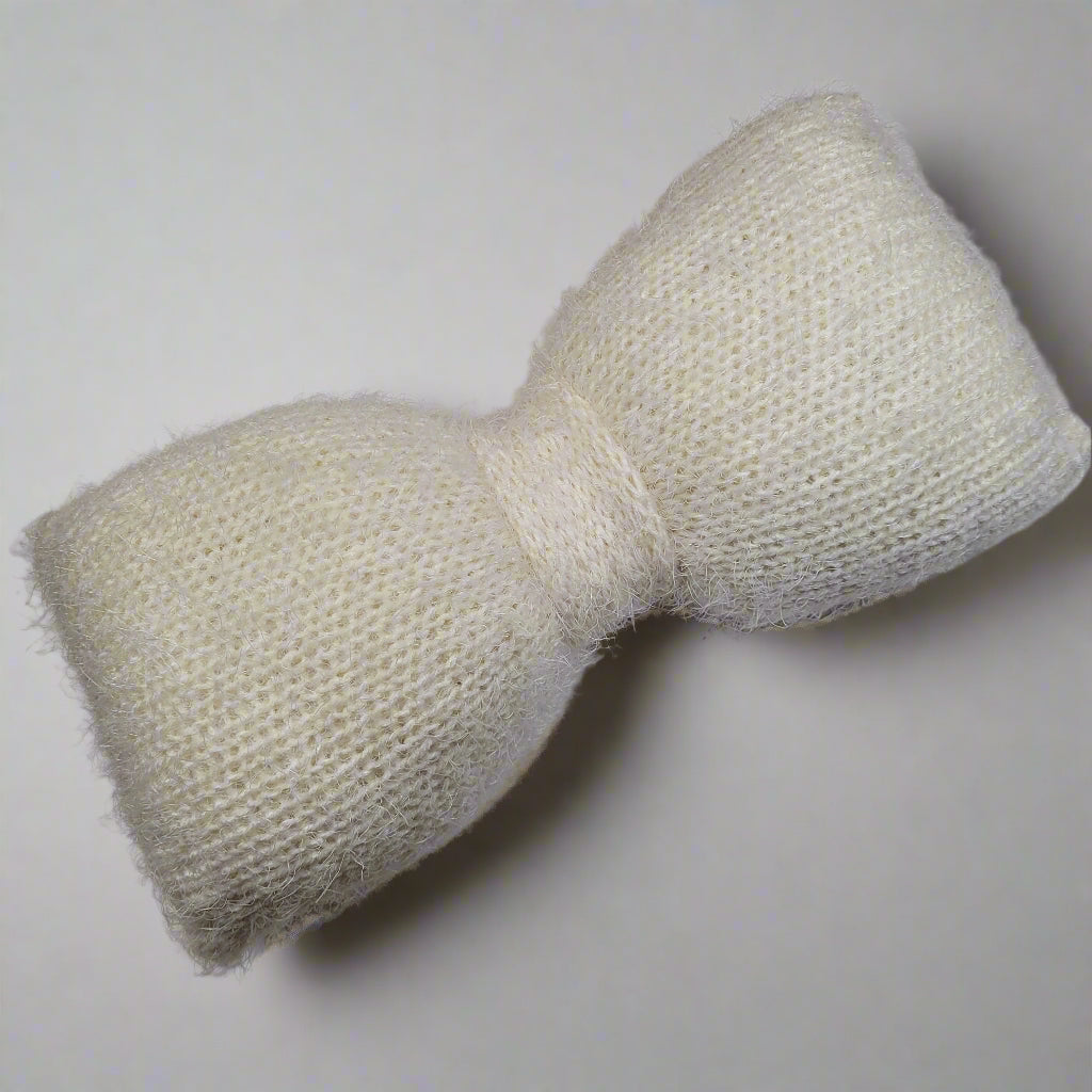 • handmade knitted pillow in a bow shape that's super soft and fluffy to the touch