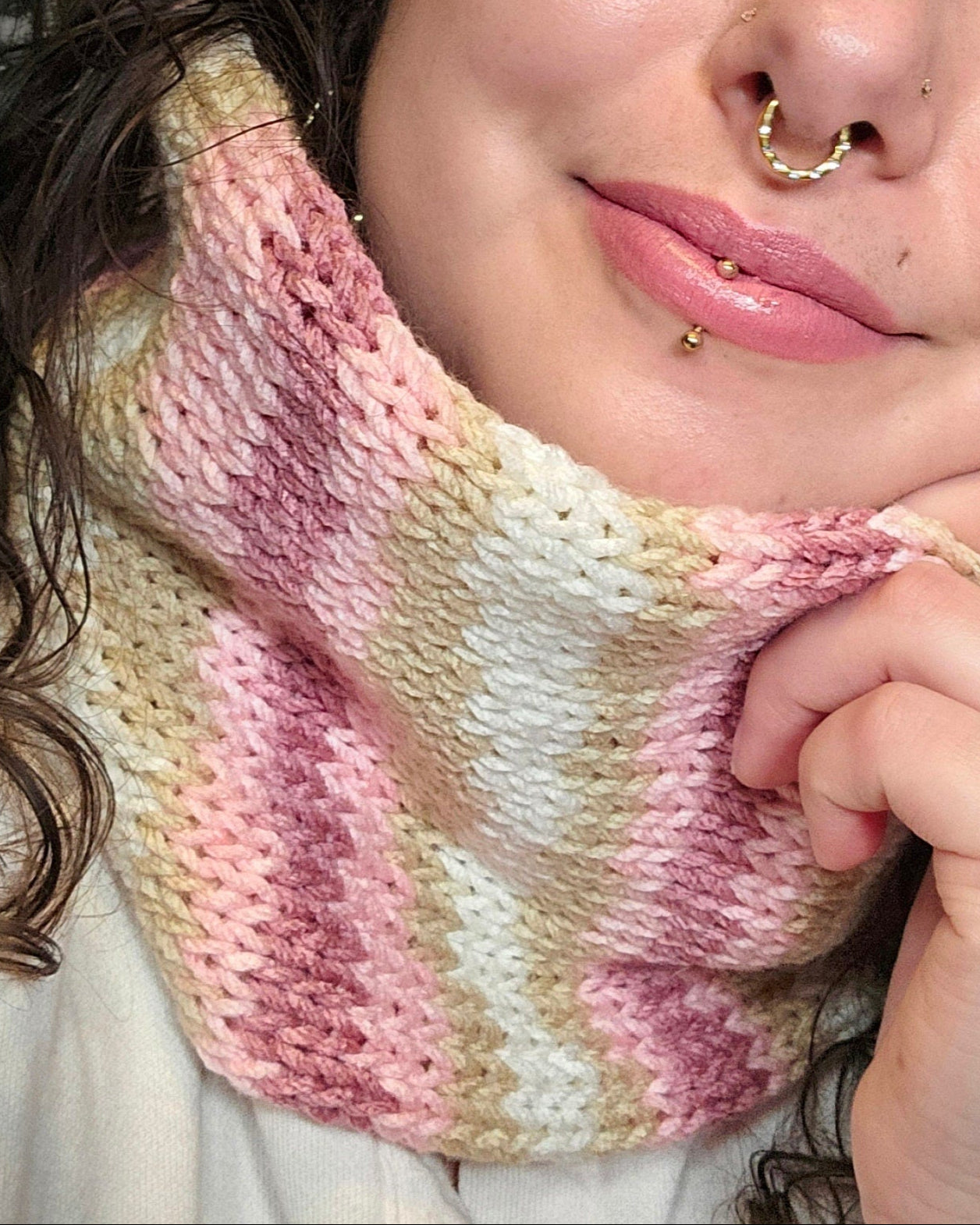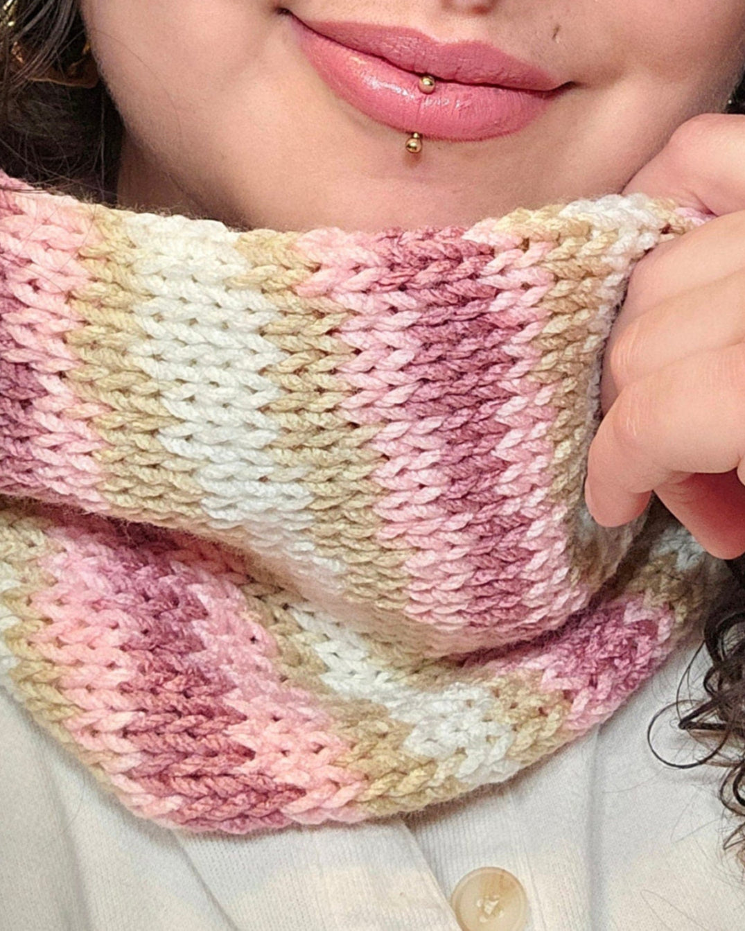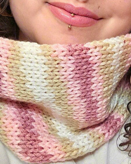 • handmade knitted cowl scarf in a beautiful colour combination of purple, pink, beige, and white vertical stripes