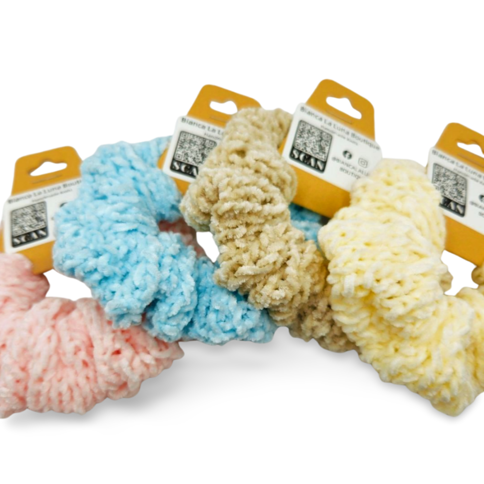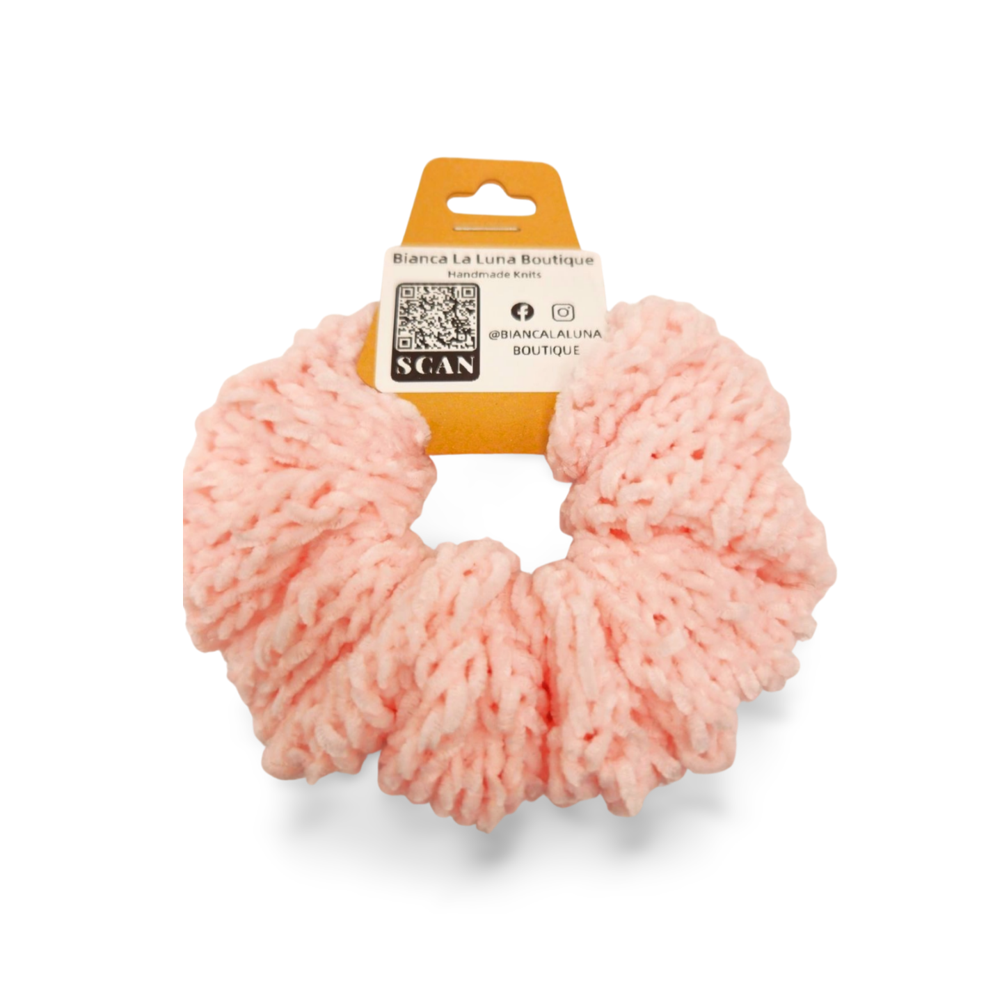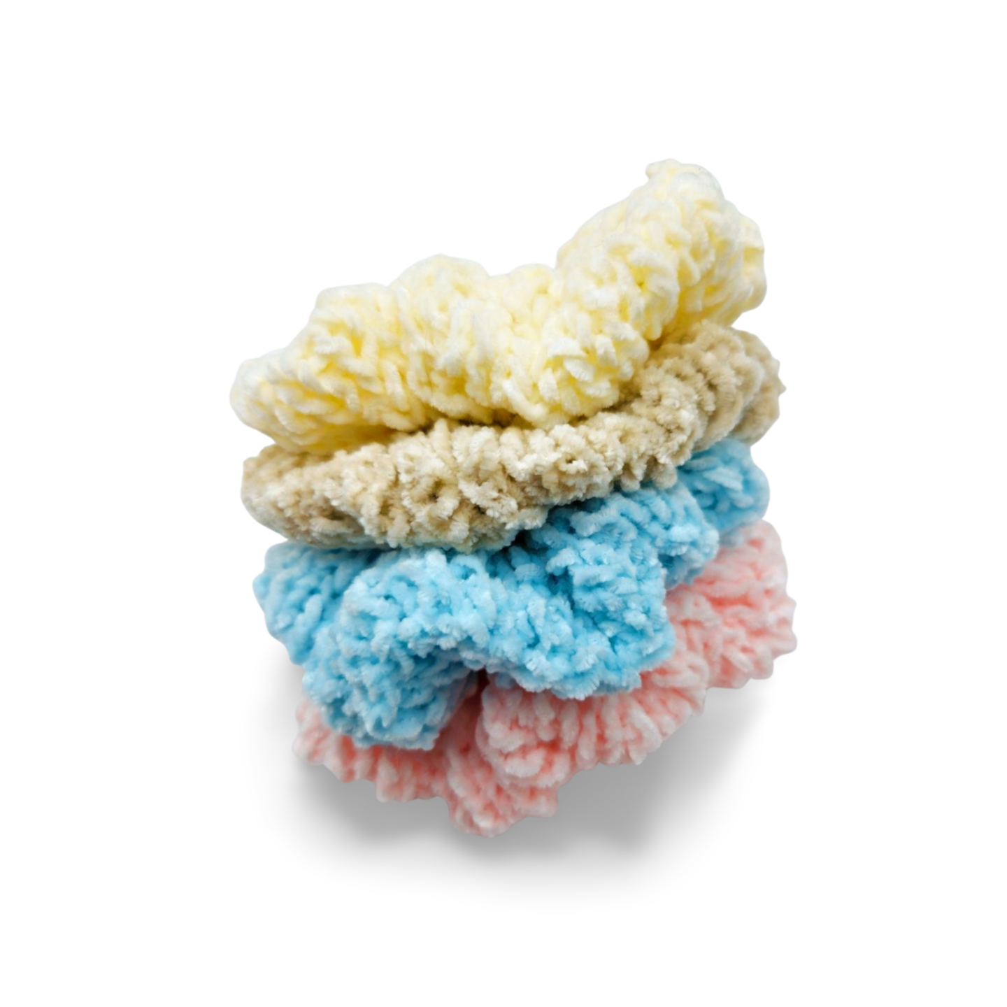 • knitted hair scrunchies available in light blue, pink, beige, and white in velvety, super soft polyester