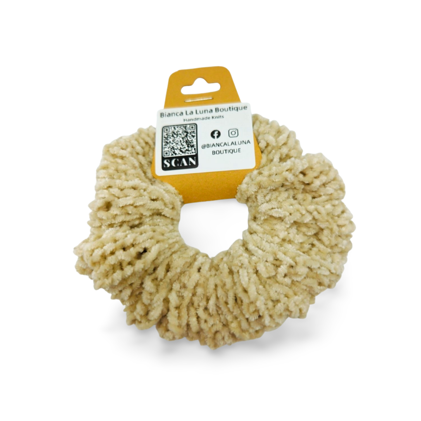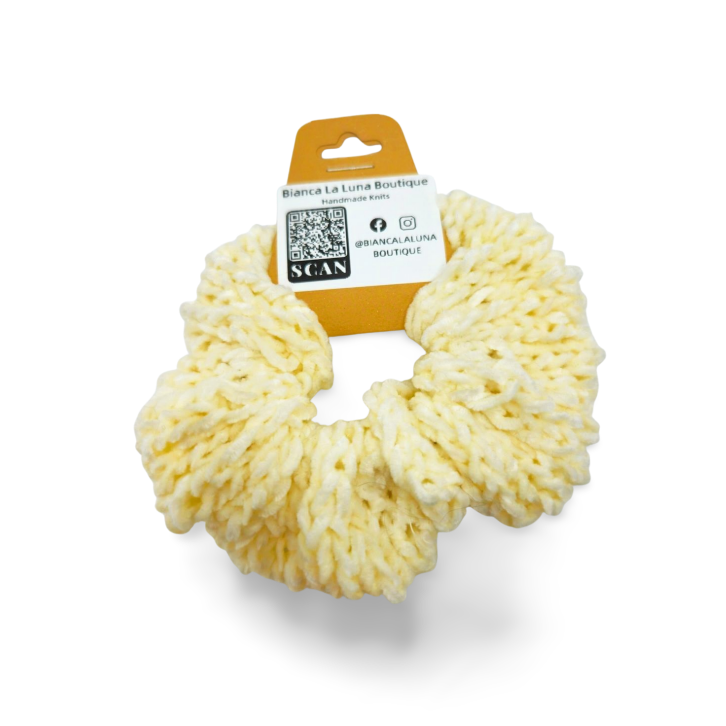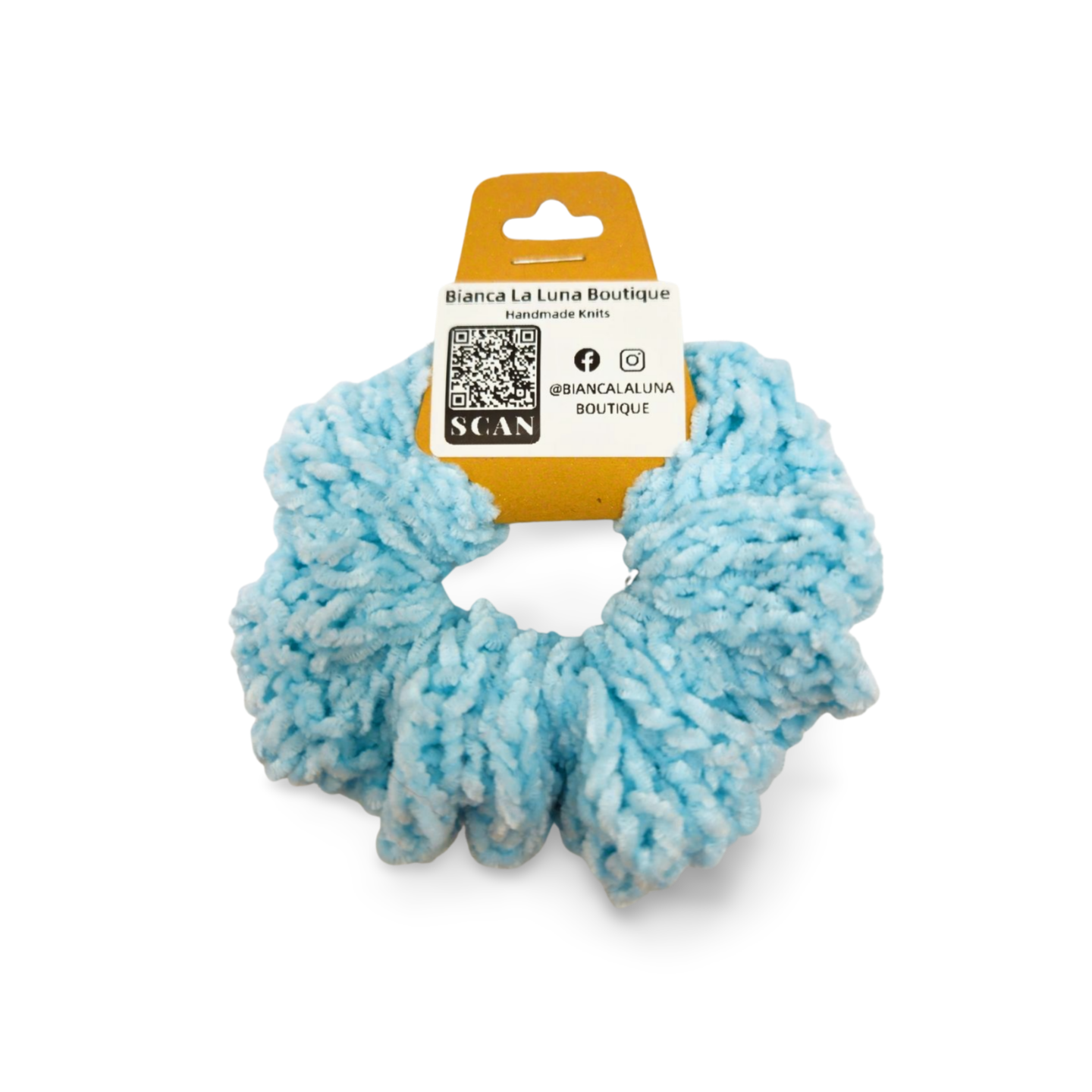 • knitted hair scrunchies available in light blue, pink, beige, and white in velvety, super soft polyester
