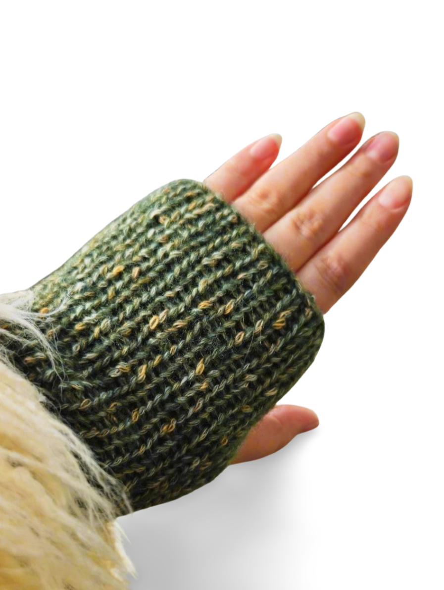 • handmade pair of knitted fingerless gloves made in beautiful heathered tweed colours